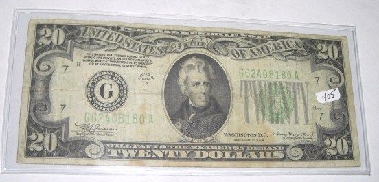 1934 SERIES A $20 NOTE *NICE EARLY BILL* SERIAL # G62408180A!! BILL CAME OUT OF SAFE!! ***Coin, Currency & All Items Listed in this auction - Grades, Conditions and Values are not Safe Deposit Coins LLC Responsibilty. Grades, Condition and Values are determined by Consigner(s) & Buyers ONLY