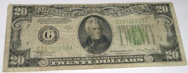 1934 SERIES A $20 *OLD FACE JACKSON* U.S. BILL SERIAL # G19702033A *NICE EARLY U.S. BILL*!! BILL CAME OUT OF SAFE!! ***Coin, Currency & All Items Listed in this auction - Grades, Conditions and Values are not Safe Deposit Coins LLC Responsibilty. Grades, Condition and Values are determined by Consigner(s) & Buyers ONLY