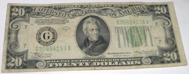 1934 SERIES A $20 *OLD FACE JACKSON* U.S. BILL SERIAL # G36694153A *NICE EARLY U.S. BILL*!! BILL CAME OUT OF SAFE!! ***Coin, Currency & All Items Listed in this auction - Grades, Conditions and Values are not Safe Deposit Coins LLC Responsibilty. Grades, Condition and Values are determined by Consigner(s) & Buyers ONLY