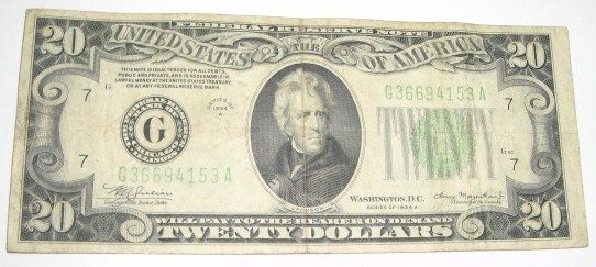 1934 SERIES A TWENTY $20 U.S. FEDERAL RESERVE NOTE *RARE HIGH GRADE* SERIAL # G36694153A!! ***Coin, Currency & All Items Listed in this auction - Grades, Conditions and Values are not Safe Deposit Coins LLC Responsibilty. Grades, Condition and Values are determined by Consigner(s) & Buyers ONLY***