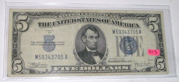 1934 SERIES C $5 SILVER CERTIFICATE SERIAL # M59343705A *RARE VERY FINE GRADE EARLY NOTE*!! BILL CAME OUT OF SAFE BOX!! ***Coin, Currency & All Items Listed in this auction - Grades, Conditions and Values are not Safe Deposit Coins LLC Responsibilty. Grades, Condition and Values are determined by Consigner(s) & Buyers ONLY