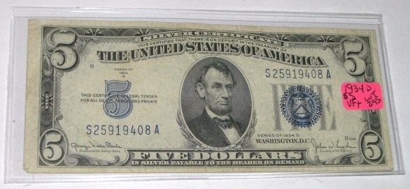 1934 SERIES D $5.00 SILVER CERTIFICATE BILL SERIAL # S25919408A *RARE VERY FINE+ EARLY NOTE*!! DOLLAR BILL CAME OUT OF SAFE!! ***Coin, Currency & All Items Listed in this auction - Grades, Conditions and Values are not Safe Deposit Coins LLC Responsibilty. Grades, Condition and Values are determined by Consigner(s) & Buyers ONLY***