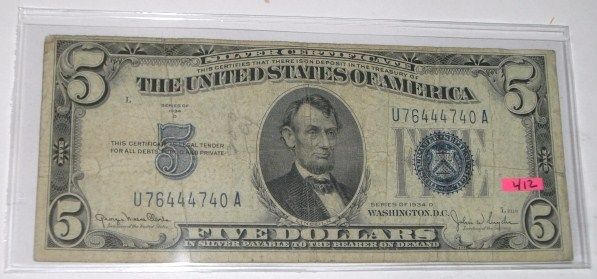 1934 SERIES D $5 SILVER CERTIFICATE SERIAL # U76444740A *RARE 4 4'S EARLY NOTE*!! BILL CAME OUT OF SAFE BOX!! ***Coin, Currency & All Items Listed in this auction - Grades, Conditions and Values are not Safe Deposit Coins LLC Responsibilty. Grades, Condition and Values are determined by Consigner(s) & Buyers ONLY
