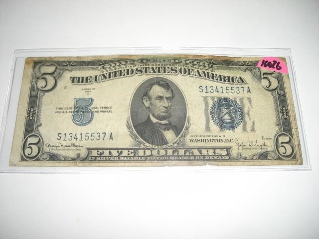 1934 SERIES D RARE *SILVER CERTIFICATE* $5.00 SERIAL # S13415537A. CURRENCY BILL CAME OUT OF SAFE!! ***Coin, Currency & All Items Listed in this auction - Grades, Conditions and Values are not Safe Deposit Coins LLC Responsibilty. Grades, Condition and Values are determined by Consigner(s)