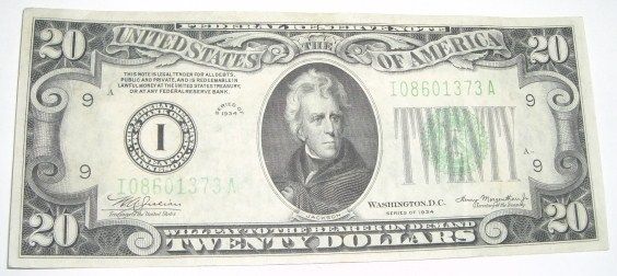 1934 SERIES TWENTY $20 U.S. FEDERAL RESERVE NOTE *RARE CRISP BILL HIGH GRADE* SERIAL # I08601373A!! ***Coin, Currency & All Items Listed in this auction - Grades, Conditions and Values are not Safe Deposit Coins LLC Responsibilty. Grades, Condition and Values are determined by Consigner(s) & Buyers ONLY***