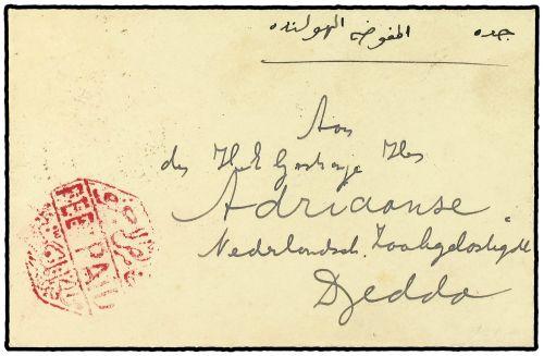 1934 Small neat cover sent from MECCA to the NETHERLANDS ZOOLOGICAL SOCIETY, DJEDDA cancelled by octagonal FEE PAID in red applied in Mecca with bilingual DJEDDA on reverse. This is the first cover recorded of the Fee Paid in red. Only a small piece in the "Hibbert" Collection has been known until now.
