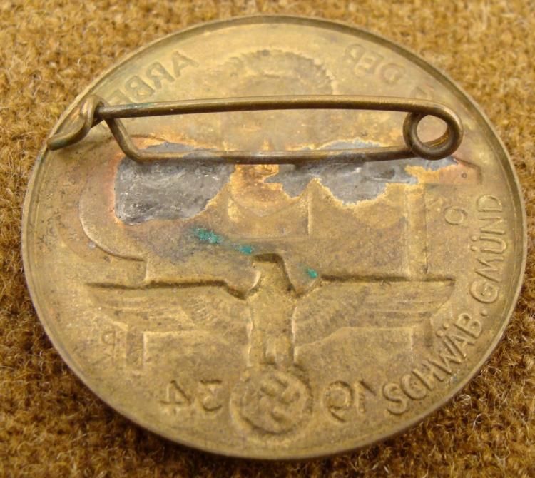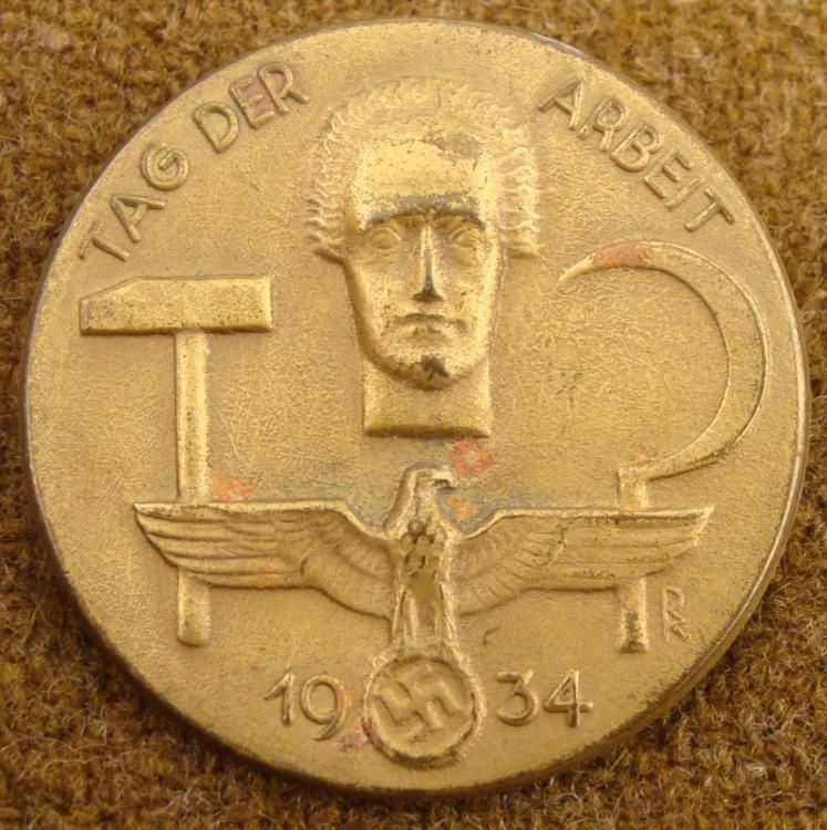 1934 TAG DER ARBEIT-MEDAL -EAGLE & SWASTIKA -HAMMER & SICKLE W/WORKER * NICE EARLY BRONZE MEDAL-REVERSE MAKER MARKED "SCHWAB -GMUND 9" *