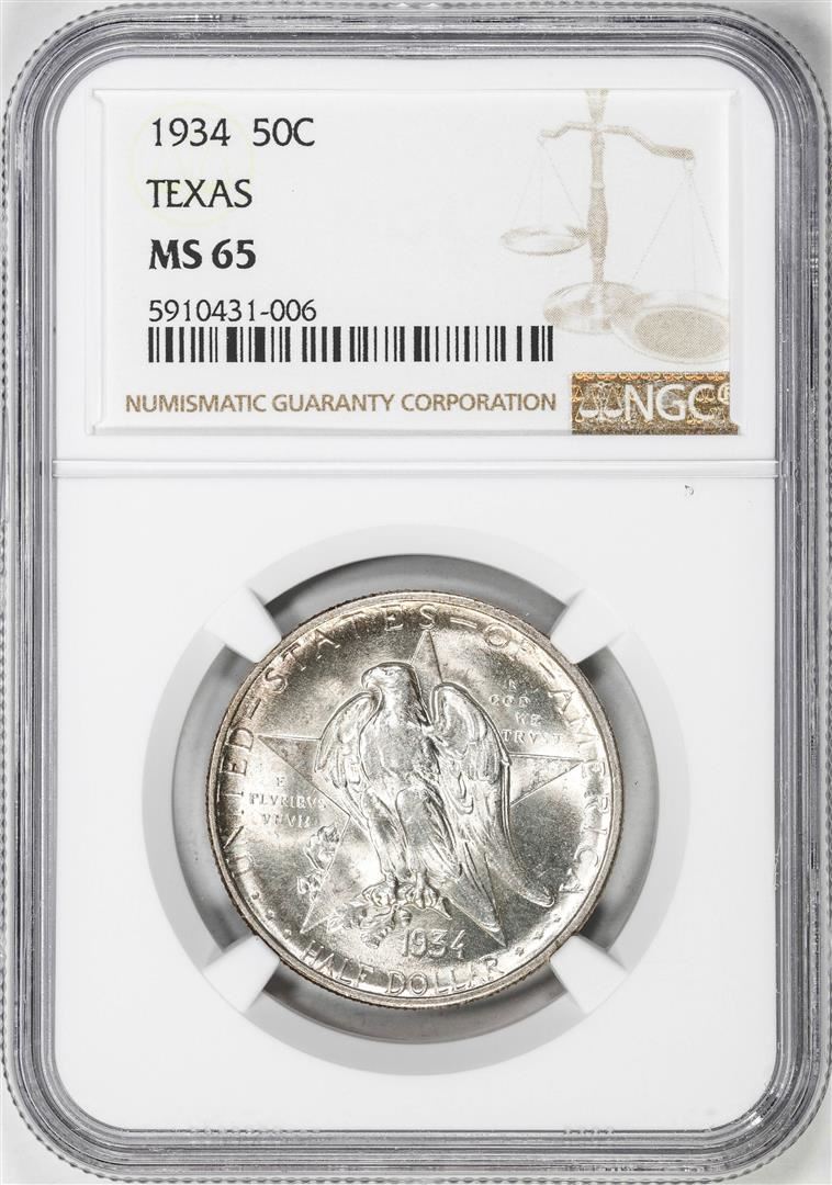 One 1934 Texas Centennial Commemorative Half Dollar Coin NGC MS65. NGC Certified.