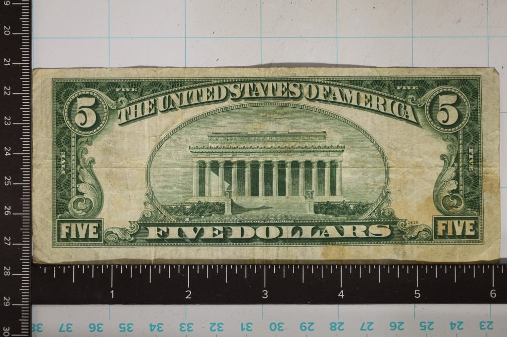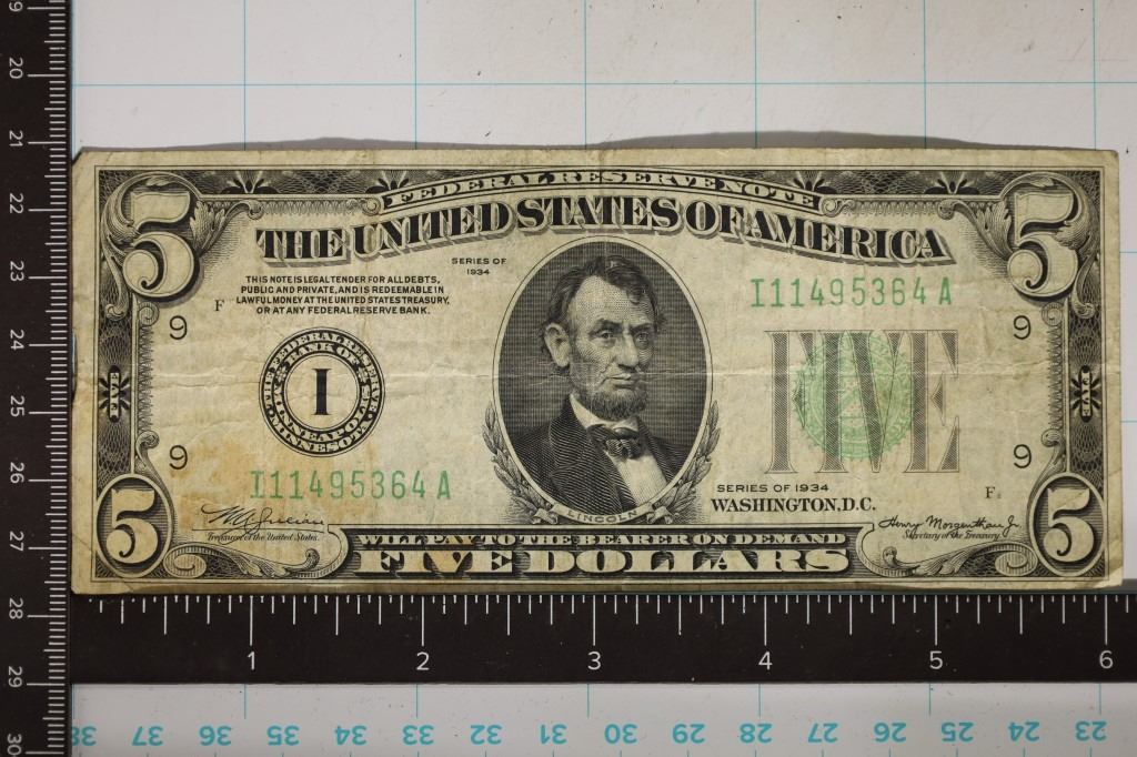 1934 US $5 FRN, GREEN SEAL, STAINED LOWER LEFT