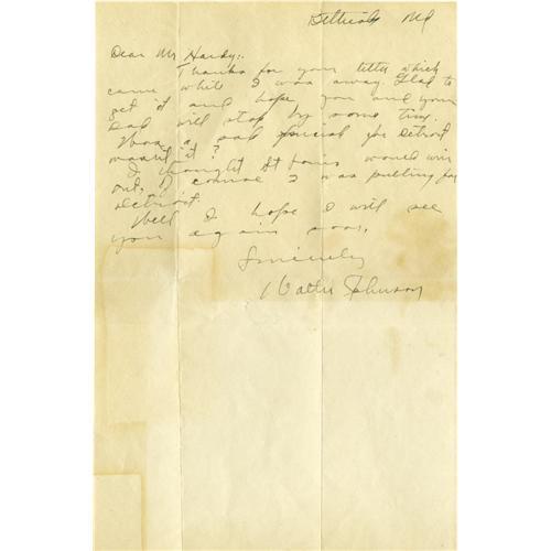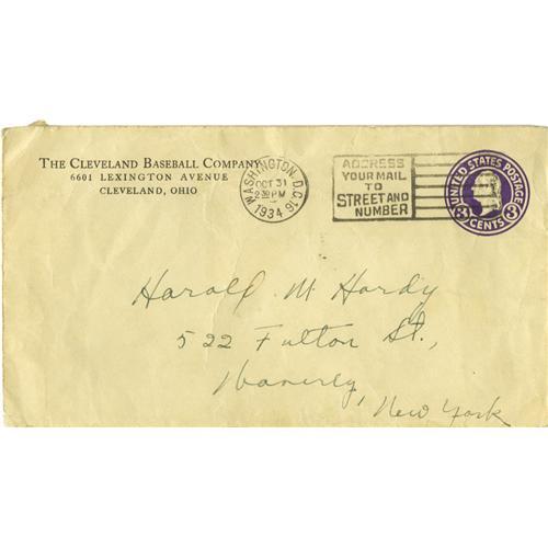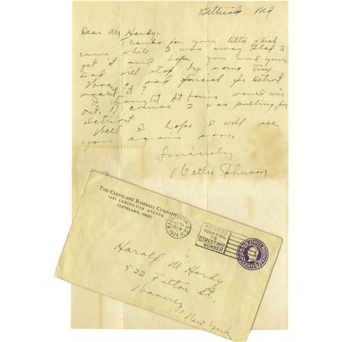 <B>1934 Walter Johnson Handwritten Signed Letter.</B></I> Tremendous baseball content makes this rare correspondence one of the most desirable of the slim supply of Johnson letters. The Big Train discusses the recent World Series victory by Dizzy Dean's Gashouse Gang, writing in part, "...Was a sad final for Detroit, wasn't it? I thought St. Louis would win out, of course I was pulling for Detroit..." While we could conclude that the 1934 Series was the subject merely by the Detroit vs. St. Louis match-up, the included "The Cleveland Baseball Company" mailing envelope, postmarked "October 31, 1934" eliminates any doubt. Both the letter and the envelope are penned entirely in Johnson's 9/10 black ink, with the former bearing the legendary hurler's closing autograph. Original mailing folds, minor paper loss that does not intersect with any writing, and a degree of uneven toning are apparent, but our catalog imagery should illustrate that these factors are of little concern. A very scarce ALS from an inaugural class Hall of Famer. <I>LOA from PSA/DNA.</B></I>