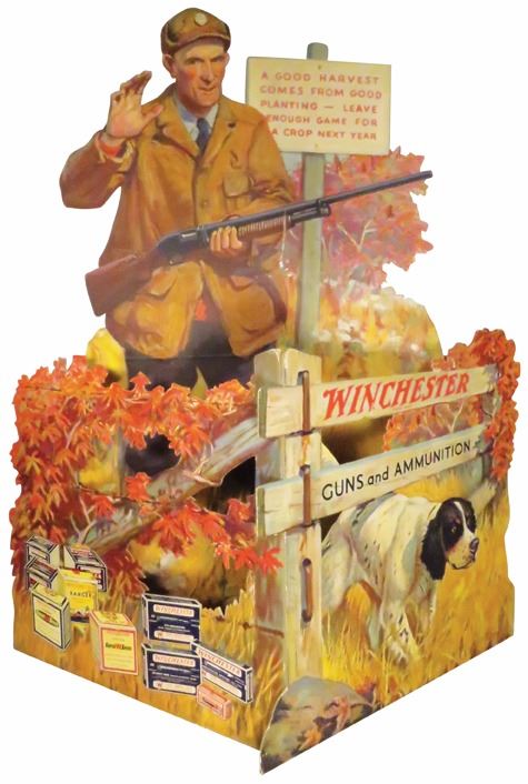 1934 Winchester Die Cut, Cardboard, Three Dimentional, Window Display. Image of hunter with Hunting Dog by famous artist Phillip R. Goodwin. Minor edgewear and small scratch in center under his gun. 38 X 41 3/4 inches set-up.