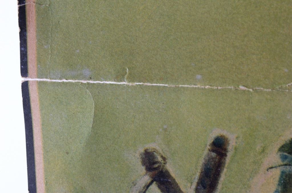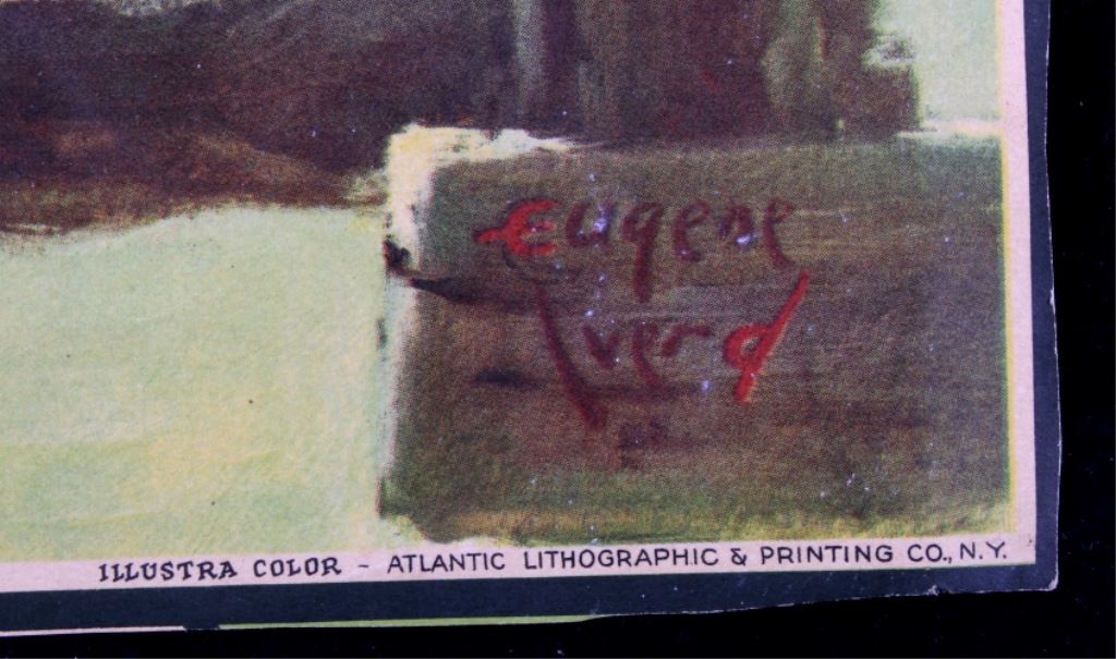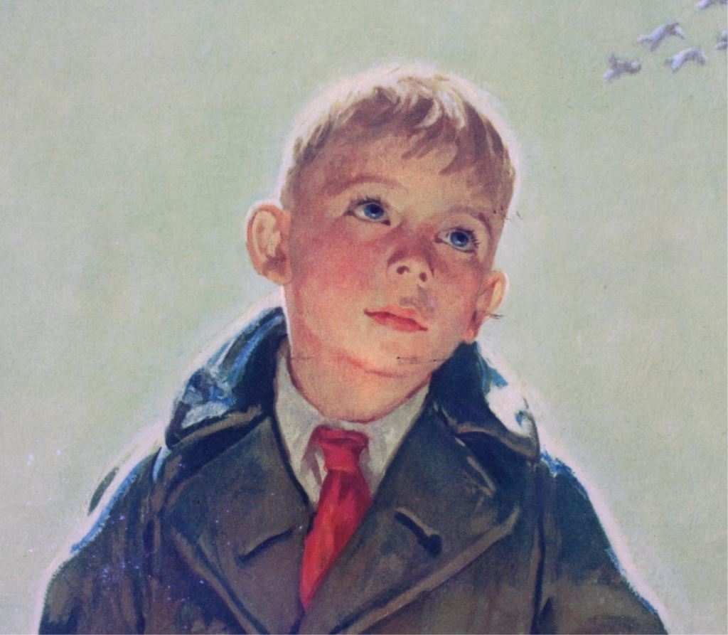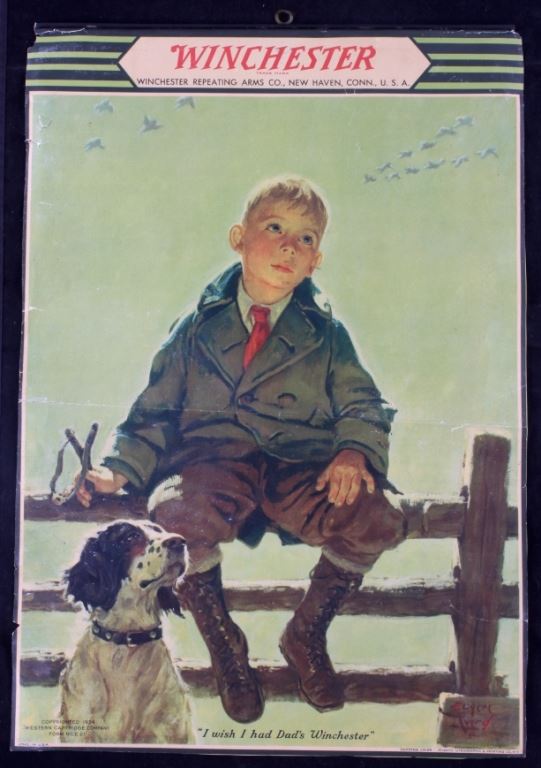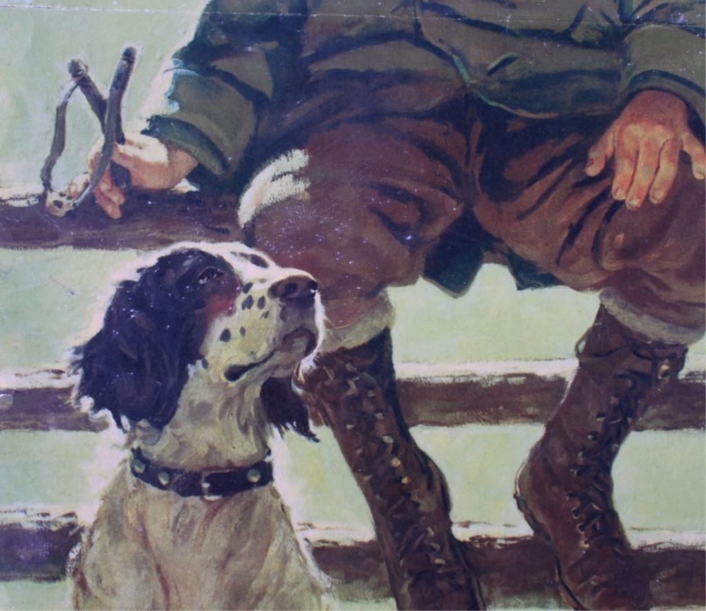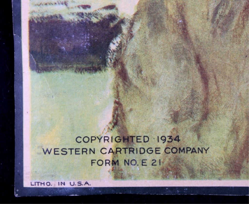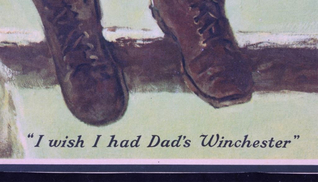 This is a 1934 Winchester lithograph. The litho shows a young sitting on a fence with his slingshot looking at the birds that are just out of his range. The litho was created by Eugene Iverd. The Winchester lithograph is in acceptable condition. It does show some damage as pictured. It measures 13.5" x 19.25".