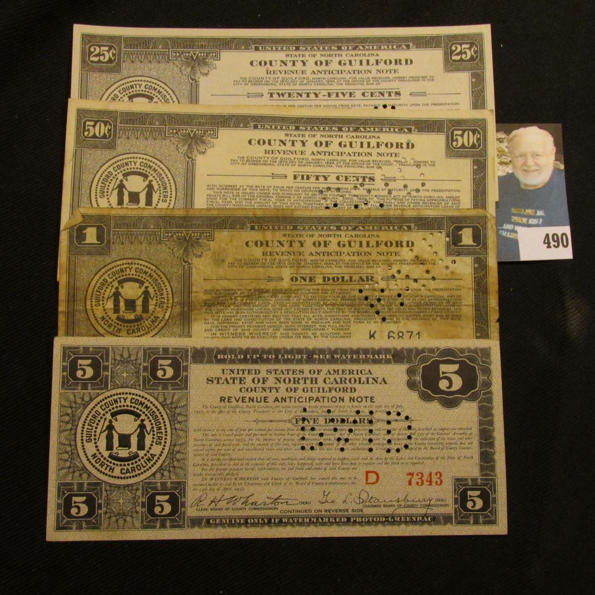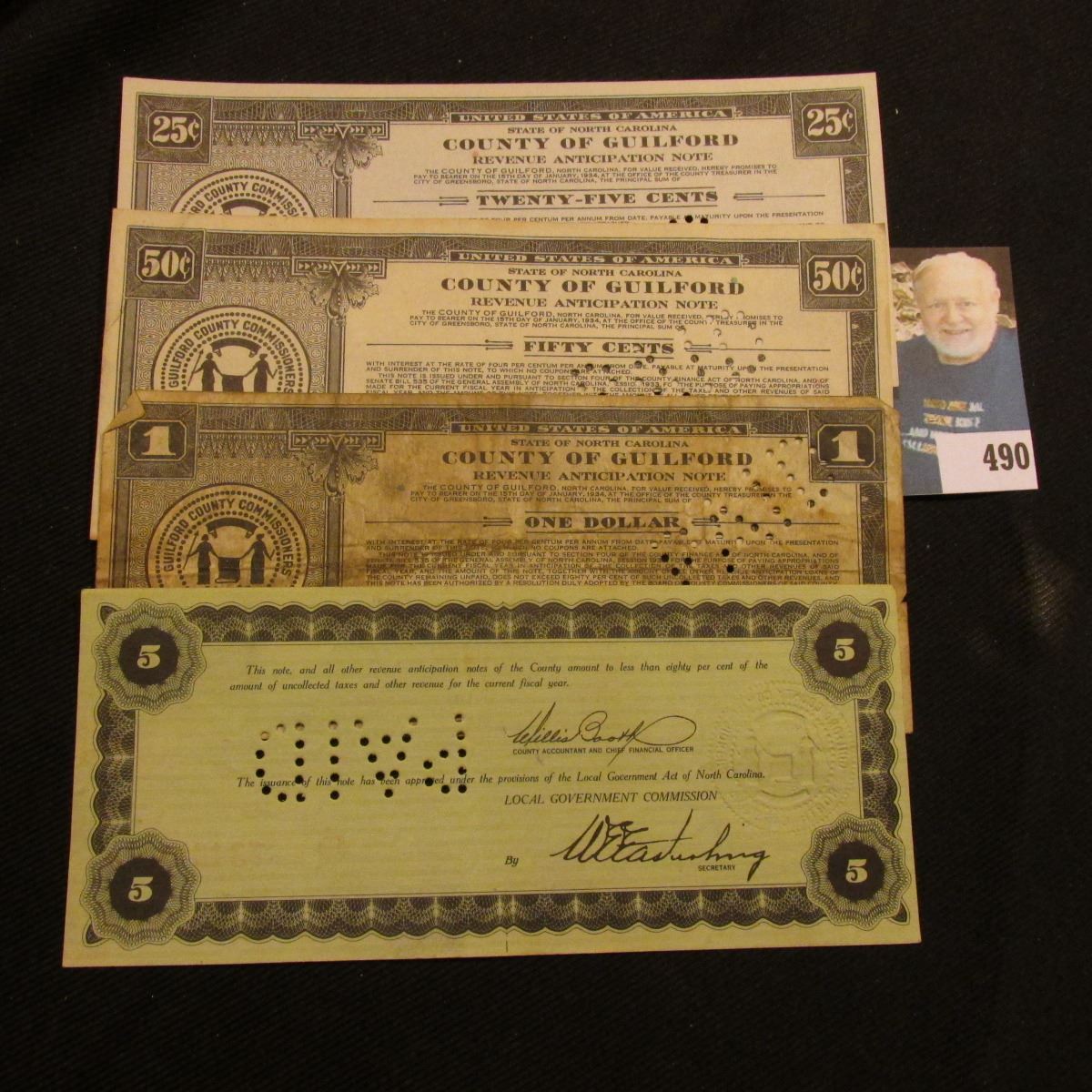 1934 four-piece set of Depression Scrip .25c, .50c, $1, & $5 State of North Carolina, County of Guilford Revenue Anticipation Notes