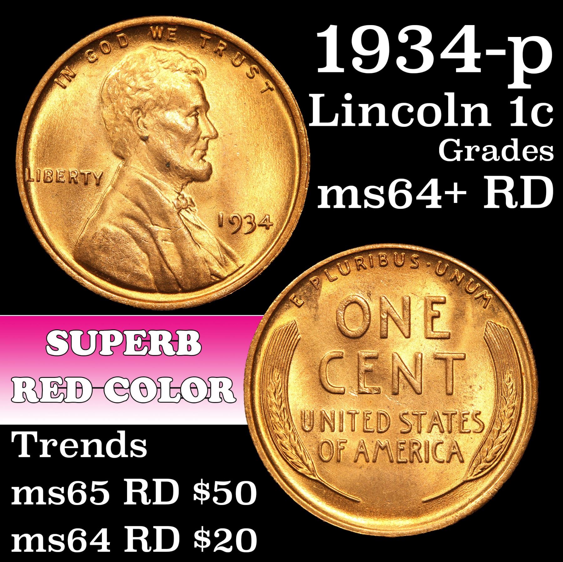 1934-p Lincoln Cent 1c Grades Choice+ Unc RD.