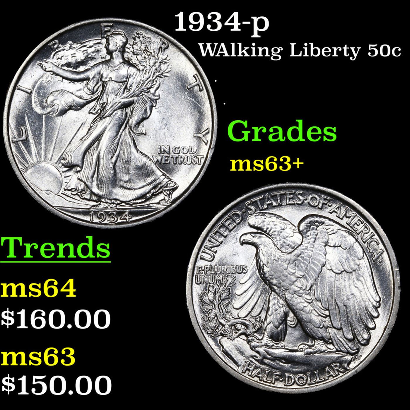 1934-p Walking Liberty Half Dollar 50c Grades Select+ Unc.