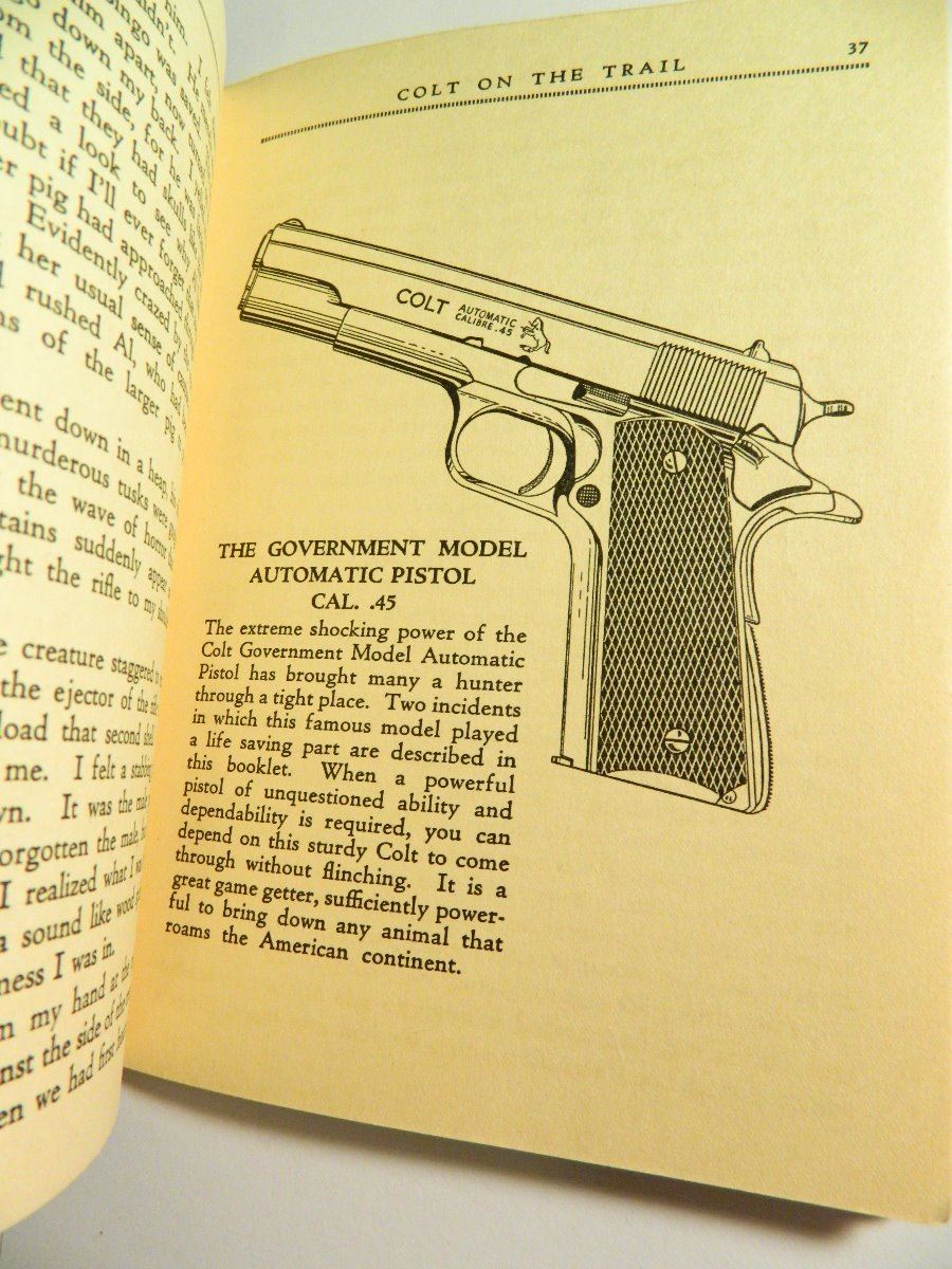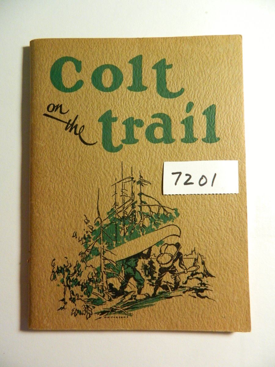 stories contained in this booklet were selected from among nearly a thousand entries in Colt's Game Story Contest. Hunting with a Hand Gun is the Theme. COLT ON THE TRAIL PUBLISHED BY COLT'S PATENT FIRE ARMS MFG. CO., HARTFORD, CT IN 1934, SECOND EDITION MARCH 1934 PAPERBACK FEATURING STORIES OF ACTUAL EXPERIENCES IN THE GREAT OUTDOORS, IN ALL OF WHICH THE COLT PLAYED AN IMPORTANT PART. ILLUSTRATED WITH PEN AND INK DRAWINGS. LAST PAGE WITH CODE A-117 ALBERT LEPPER PUBLISHING CO HARTFORD CONN.