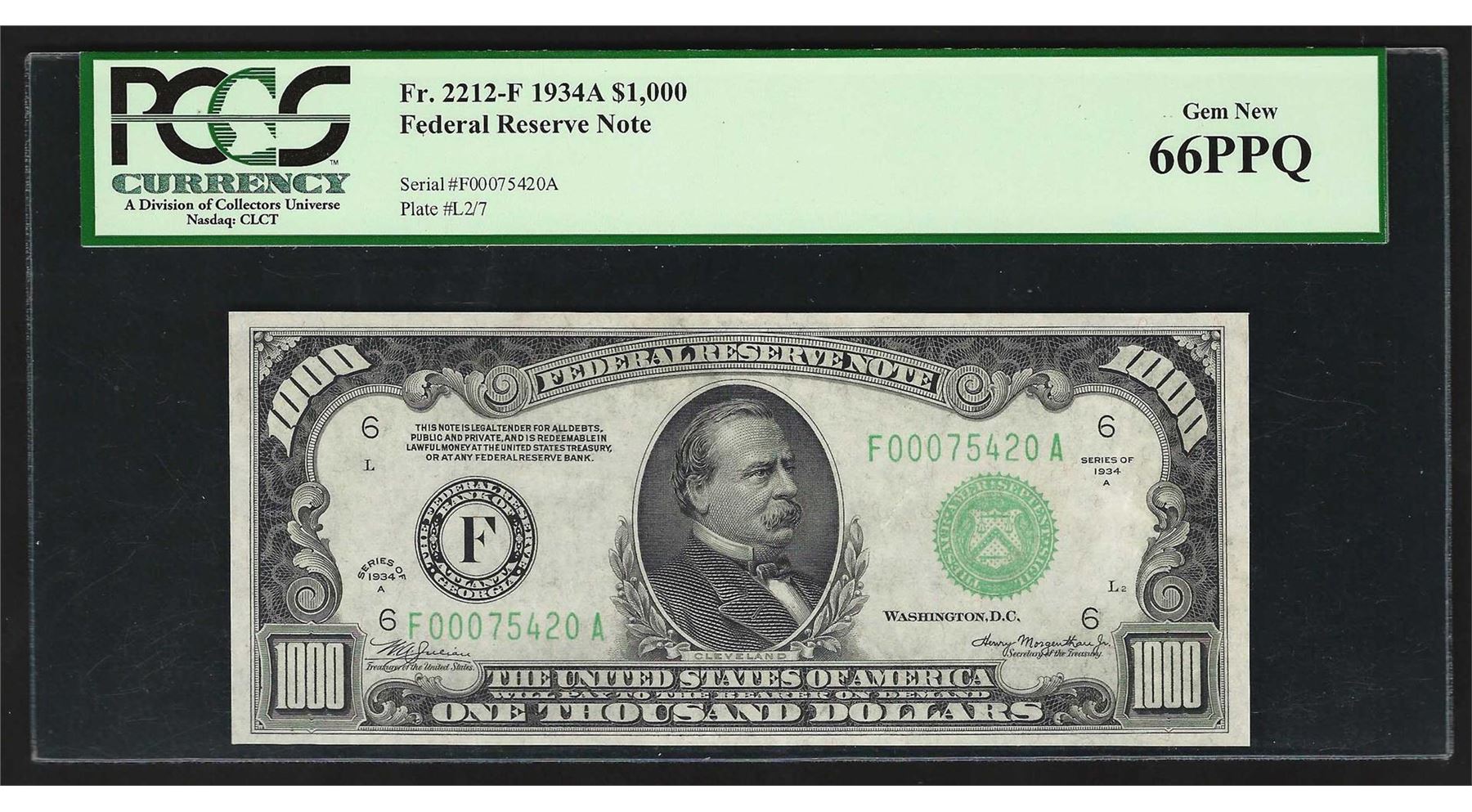 One 1934A $1,000 Federal Reserve Note Atlanta PCGS Gem New 66PPQ. PCGS Graded.