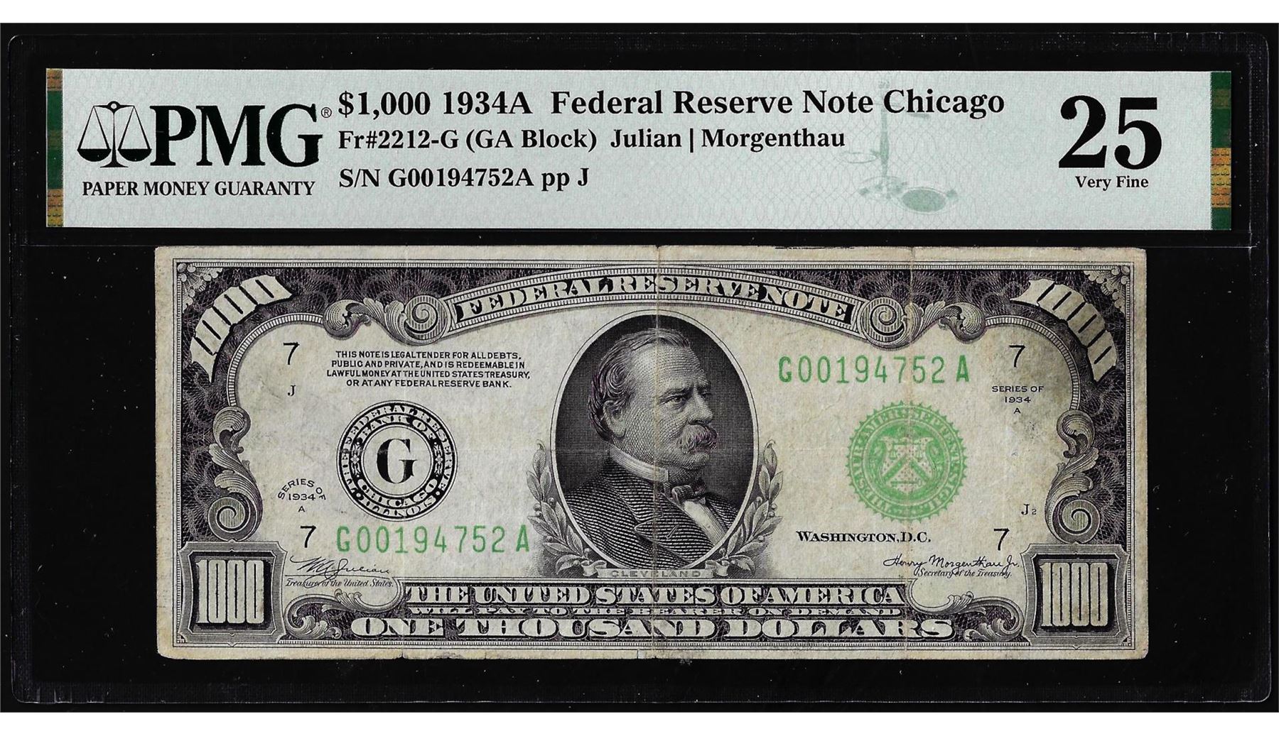 One 1934A $1,000 Federal Reserve Note Chicago Fr.2212-G PMG Very Fine 25. PMG Certified.