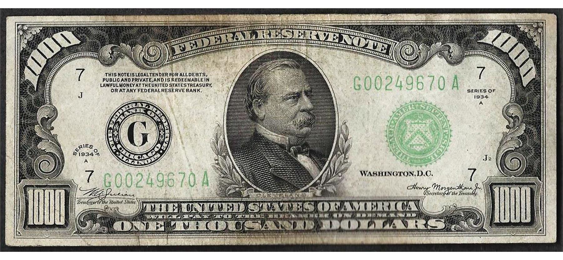 One 1934A $1,000 Federal Reserve Note Chicago.