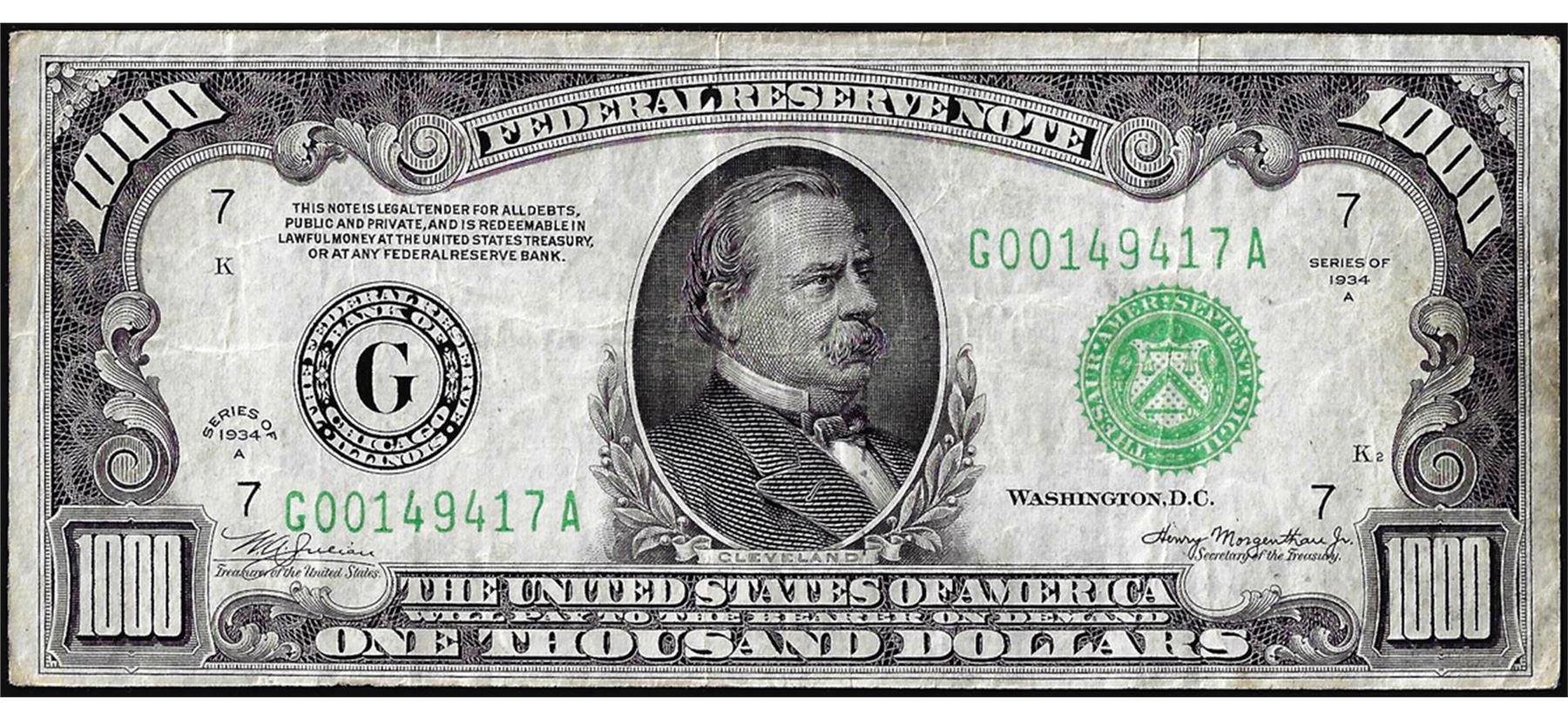 One 1934A $1,000 Federal Reserve Note Chicago.