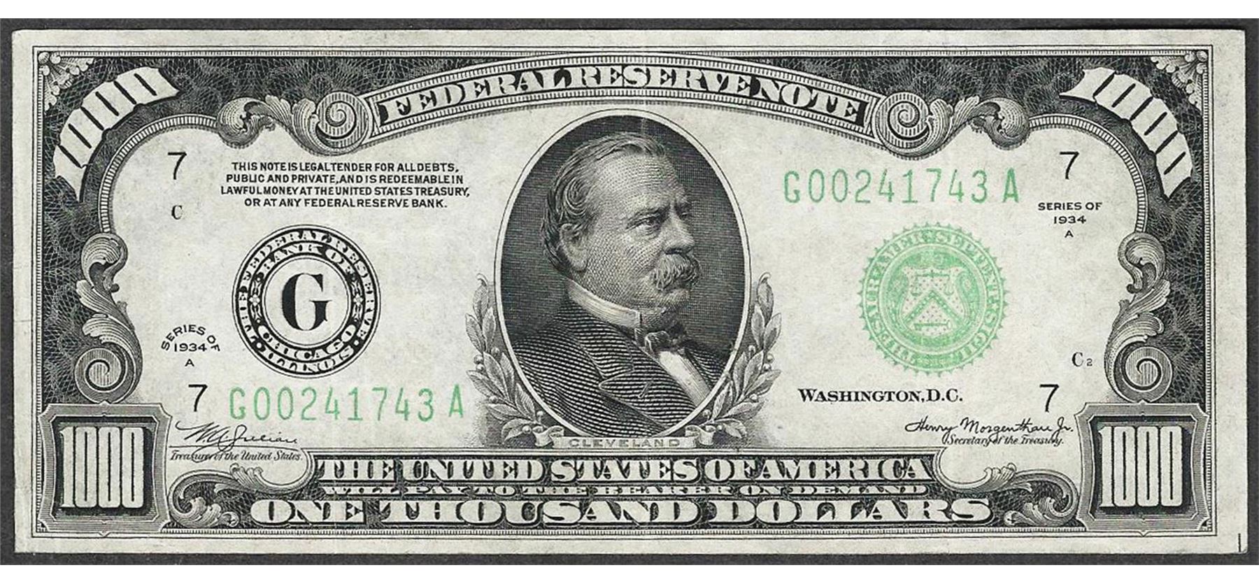 One 1934A $1,000 Federal Reserve Note Chicago.