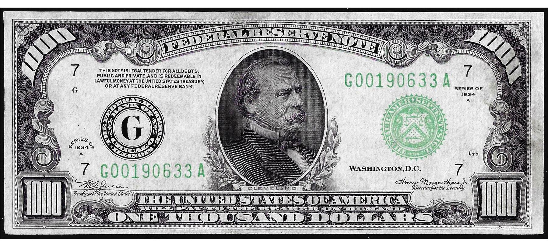 One 1934A $1,000 Federal Reserve Note Chicago.