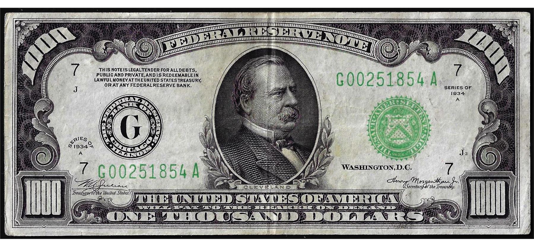 One 1934A $1,000 Federal Reserve Note Chicago.