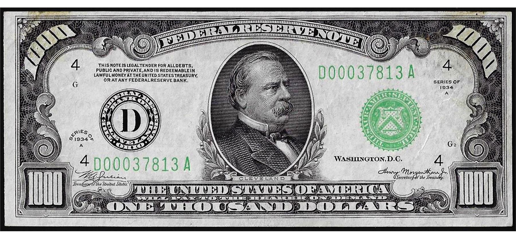 One 1934A $1,000 Federal Reserve Note Cleveland.