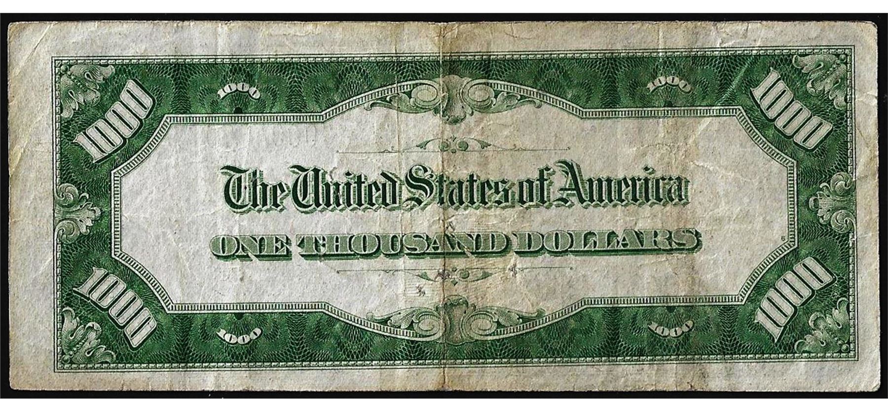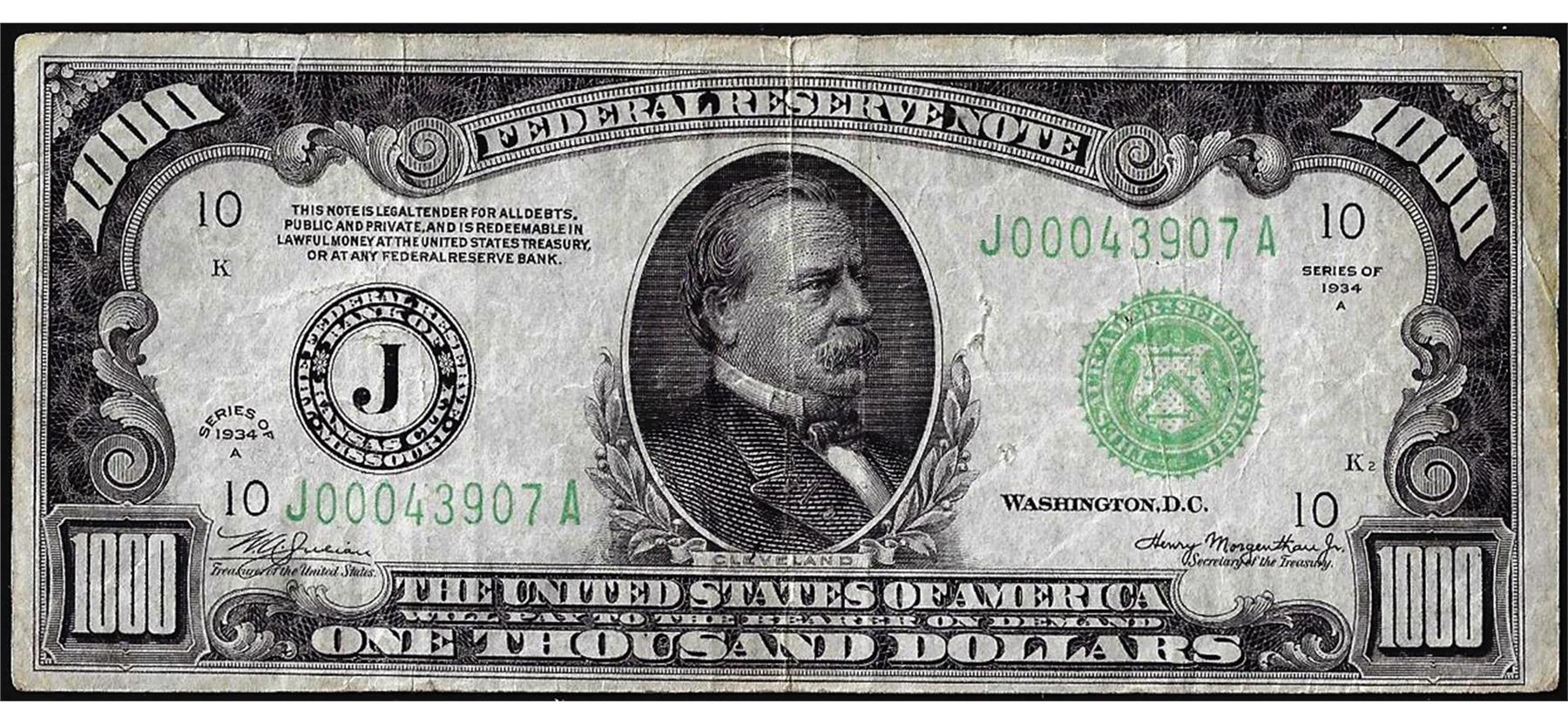 One 1934A $1,000 Federal Reserve Note Kansas City, please note a couple of pinholes to the right of the portrait.