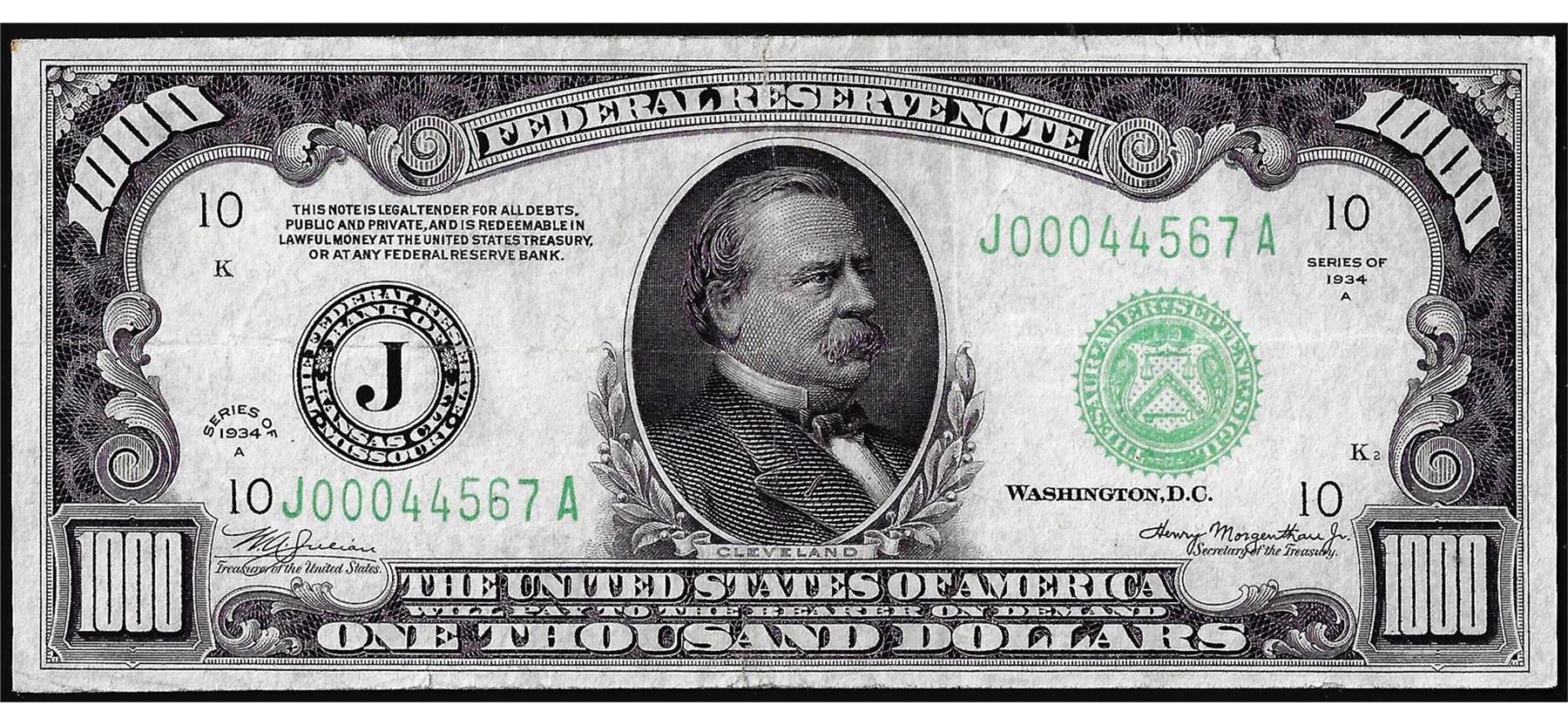 One 1934A $1,000 Federal Reserve Note Kansas City.