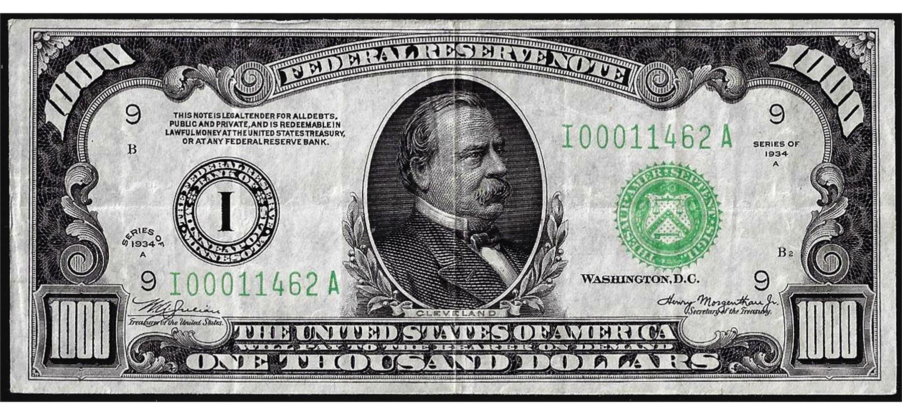 One 1934A $1,000 Federal Reserve Note Minneapolis.