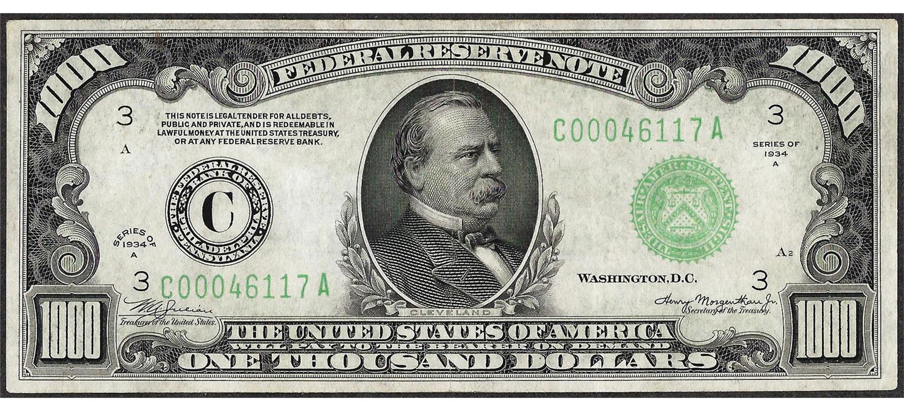 One 1934A $1,000 Federal Reserve Note Philadelphia.