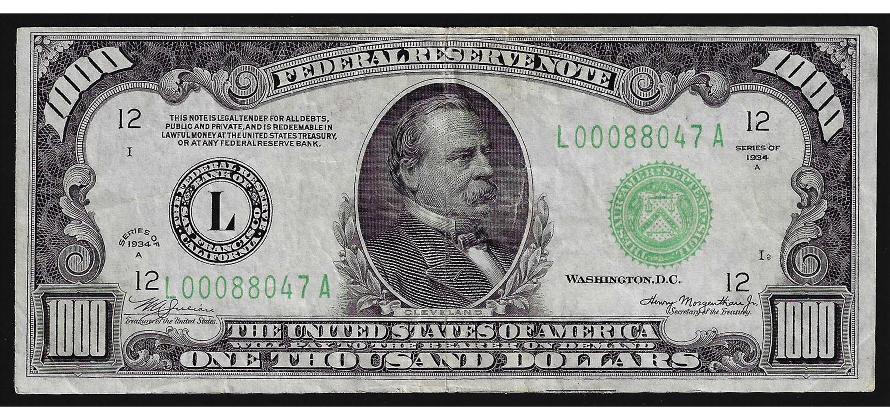 One 1934A $1,000 Federal Reserve Note San Francisco.