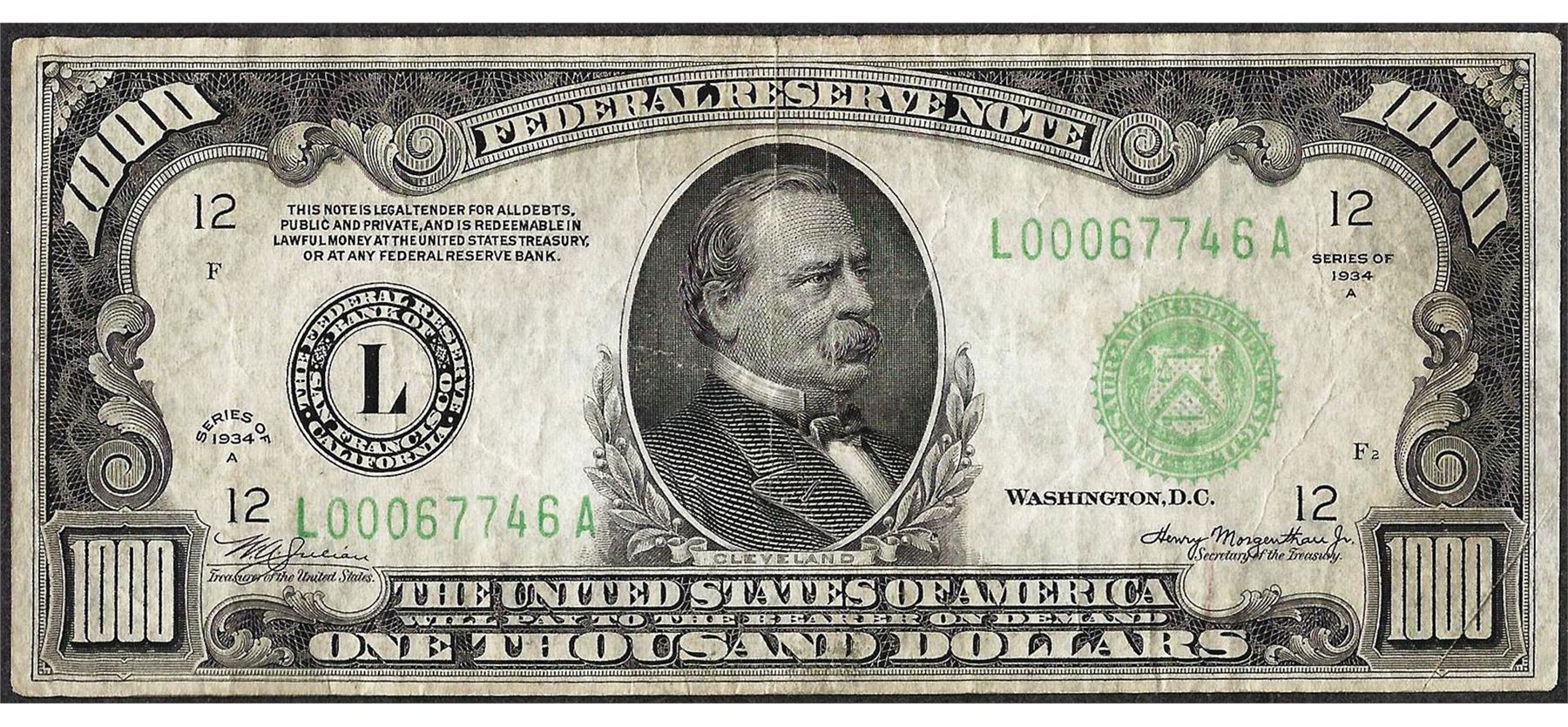 One 1934A $1,000 Federal Reserve Note San Francisco.