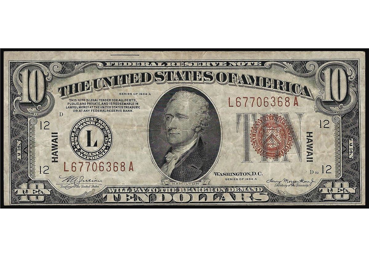 One 1934A $10 Federal Reserve Emergency Hawaii Note.