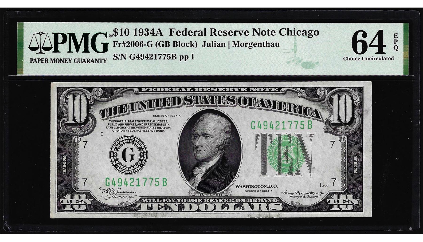 One 1934A $10 Federal Reserve Note Chicago Fr.2006-G PMG Choice Uncirculated 64EPQ. PMG Certified.