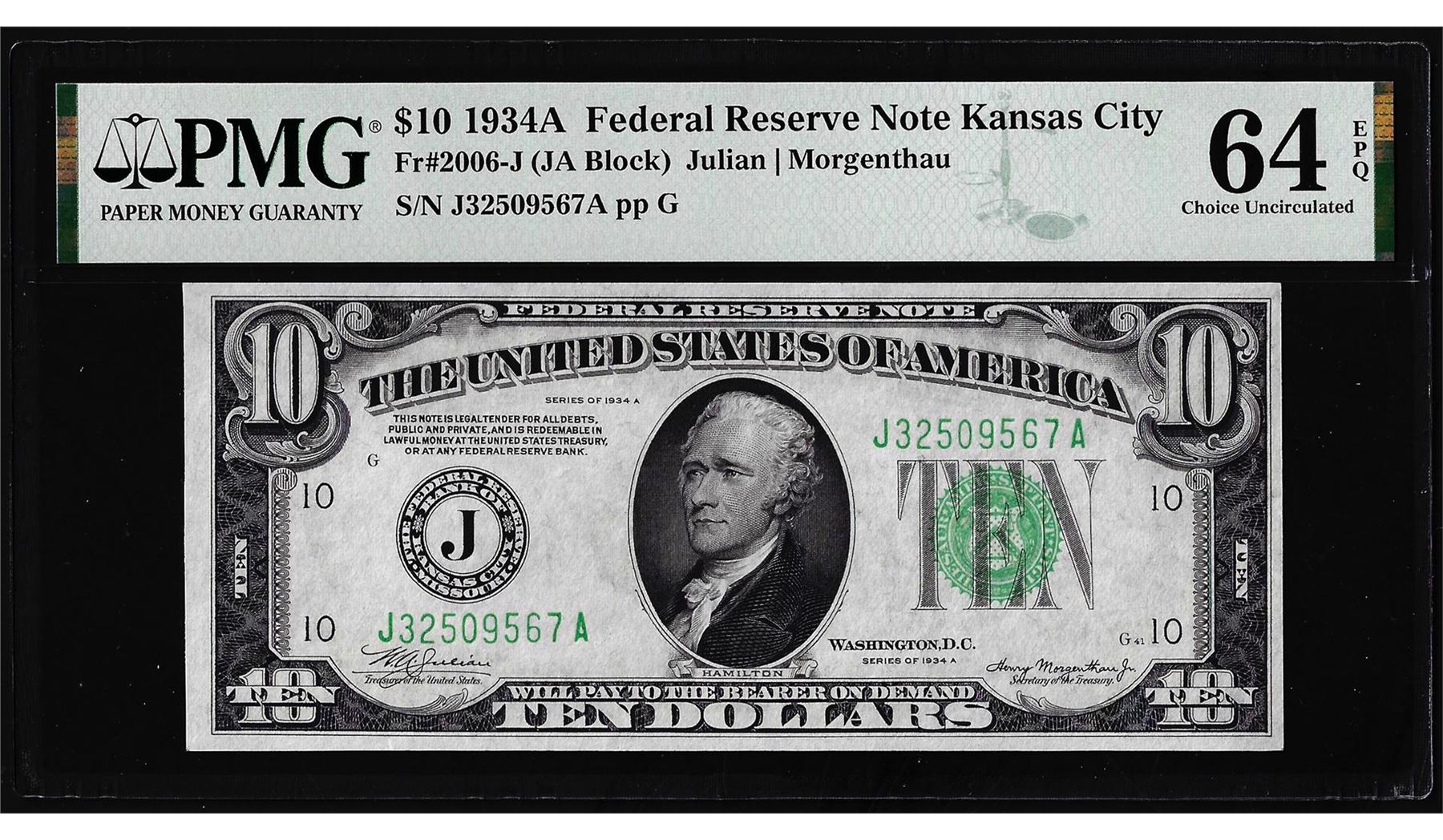 One 1934A $10 Federal Reserve Note Kansas City Fr.2006-J PMG Choice Uncirculated 64EPQ. PMG Certified.