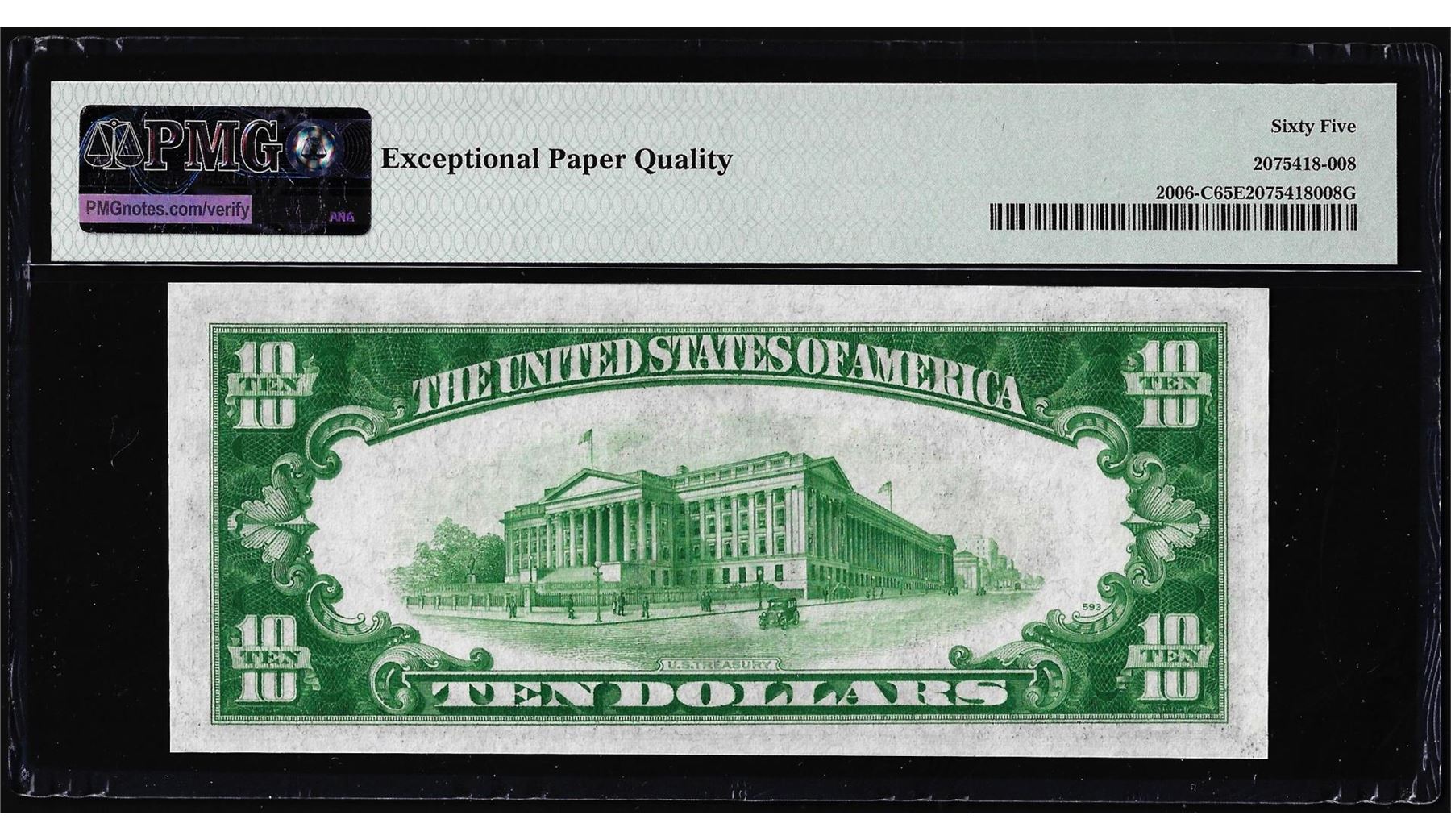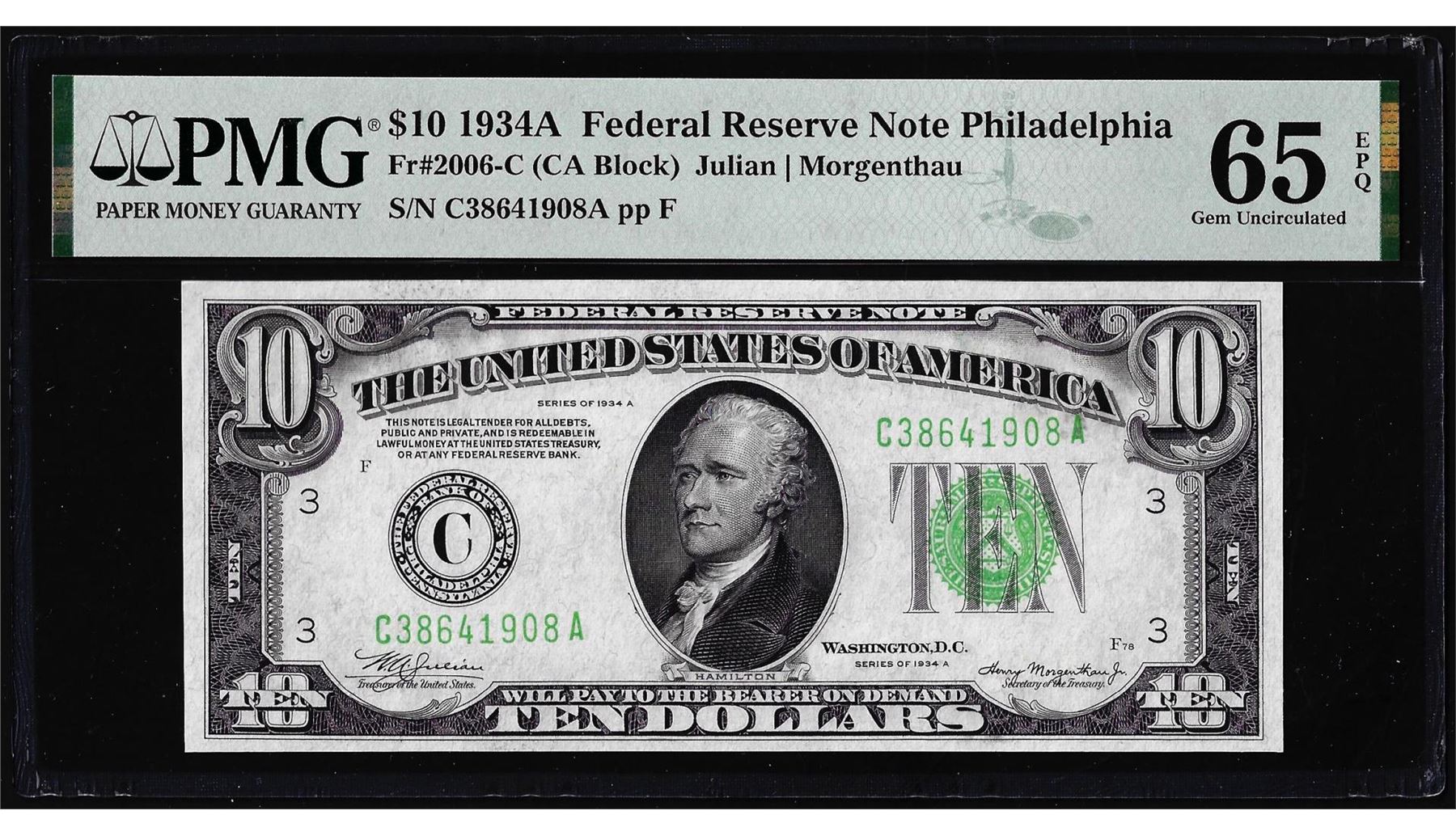One 1934A $10 Federal Reserve Note Philadelphia Fr. 2006-C PMG Gem Uncirculated 65EPQ. PMG Certified.