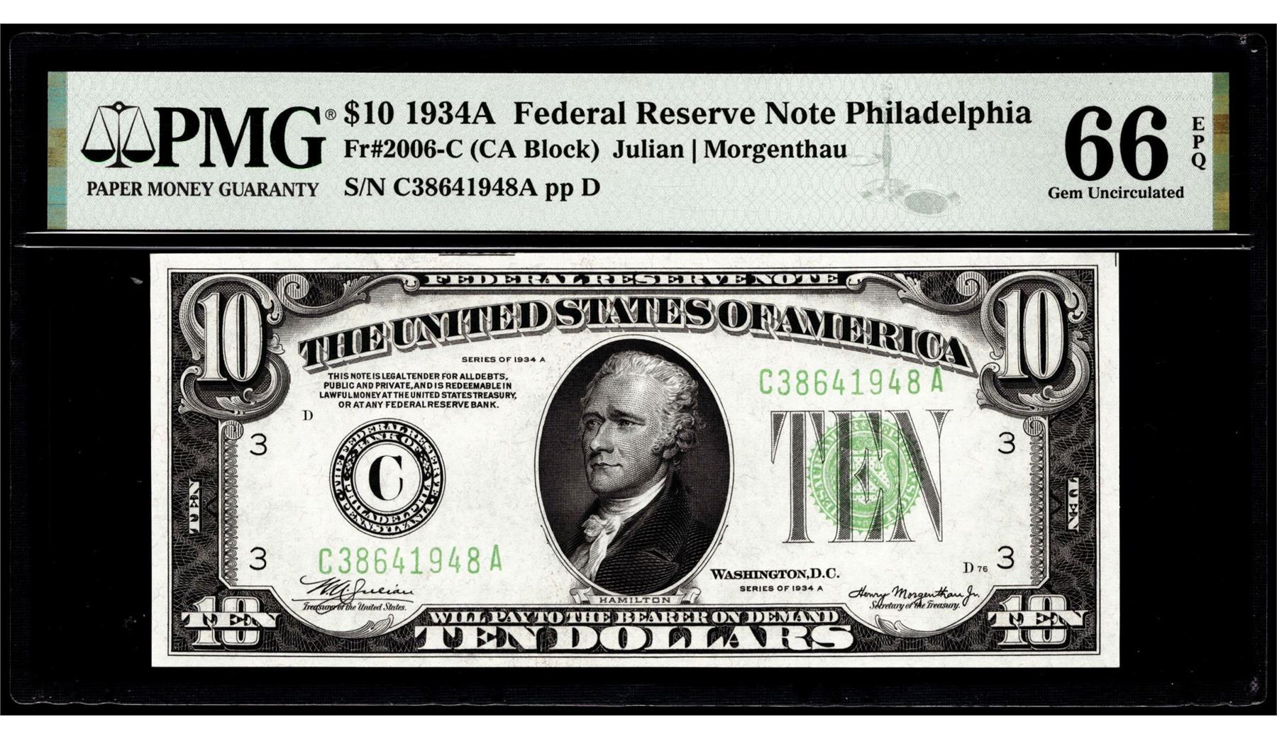 One 1934A $10 Federal Reserve Note Philadelphia Fr.2006-C PMG Gem Uncirculated 66EPQ. PMG Certified.