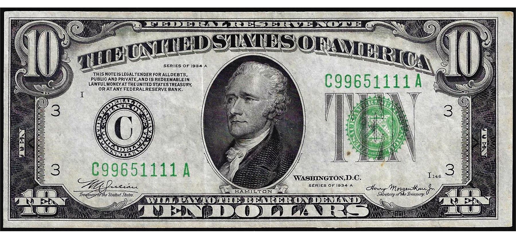 One 1934A $10 Federal Reserve Note Philadelphia.