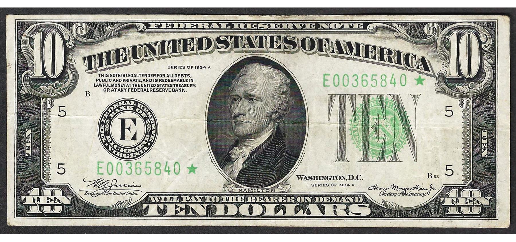 One 1934A $10 Federal Reserve STAR Note.