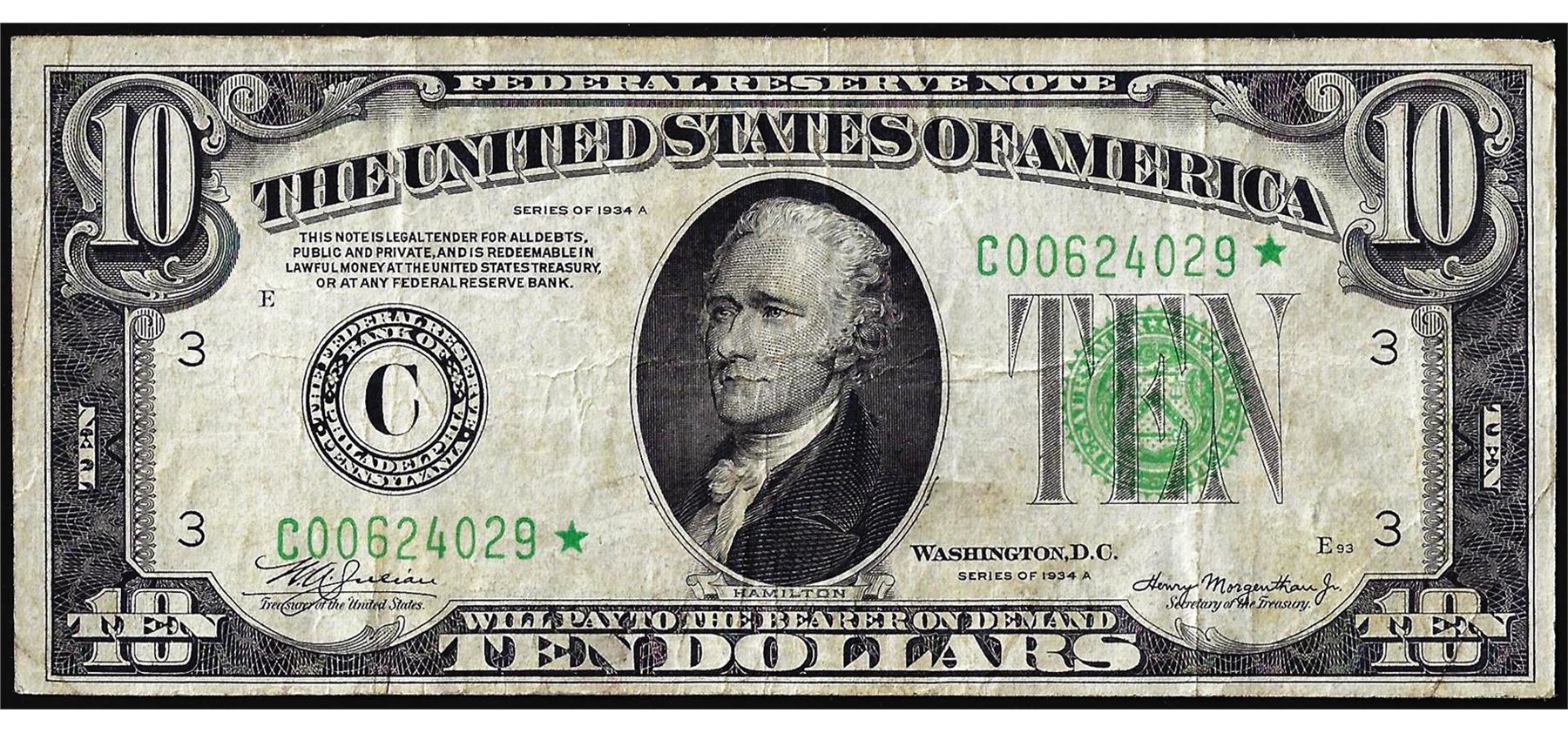One 1934A $10 Federal Reserve Star Note Philadelphia.