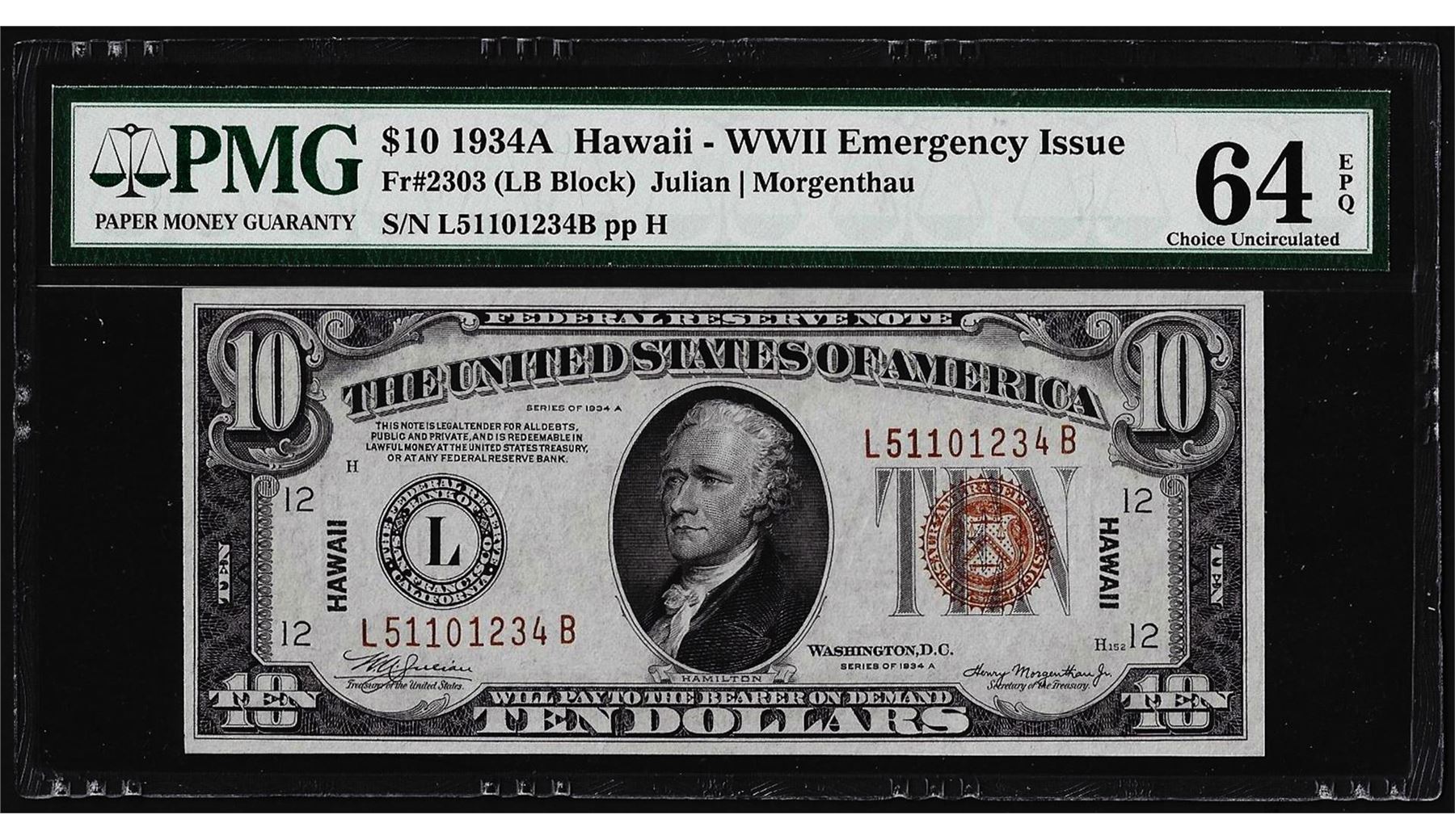 One 1934A $10 Federal Reserve WWII Emergency Hawaii Note Fr.2303 PMG Choice Uncirculated 64EPQ. PMG Certified.
