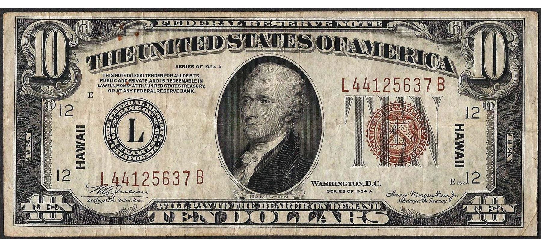 One 1934A $10 Federal Reserve WWII Emergency Hawaii Note.