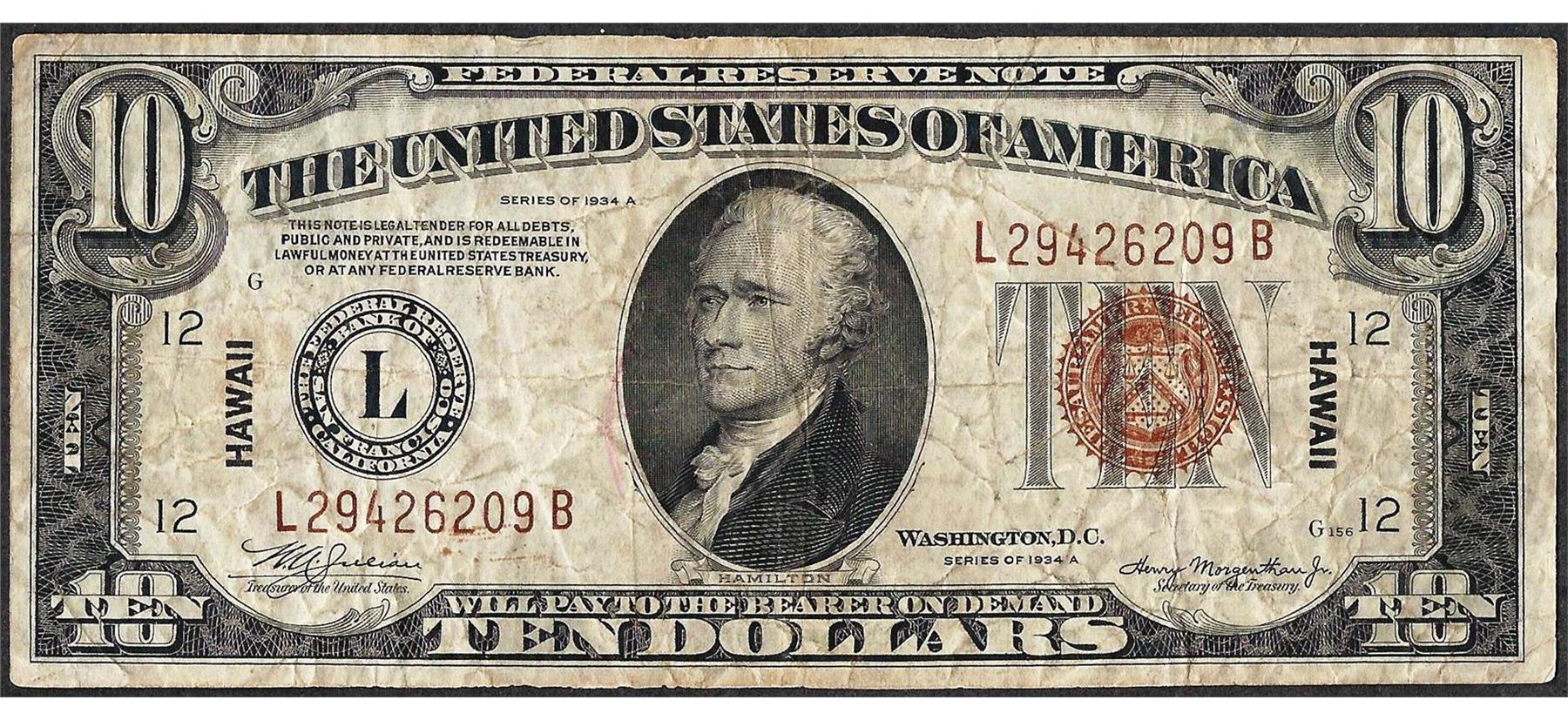 One 1934A $10 Federal Reserve WWII Emergency Hawaii Note.