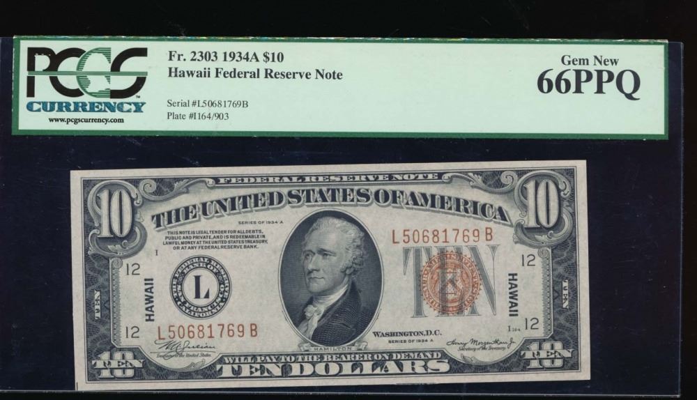 One 1934A $10 Hawaii Federal Reserve Note PCGS 66PPQ.