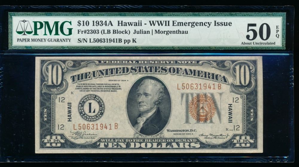 One 1934A $10 Hawaii Federal Reserve Note PMG 50EPQ.