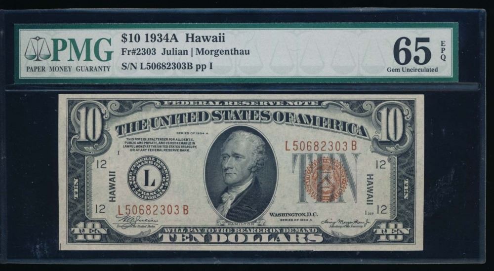 One 1934A $10 Hawaii Federal Reserve Note PMG 65EPQ.