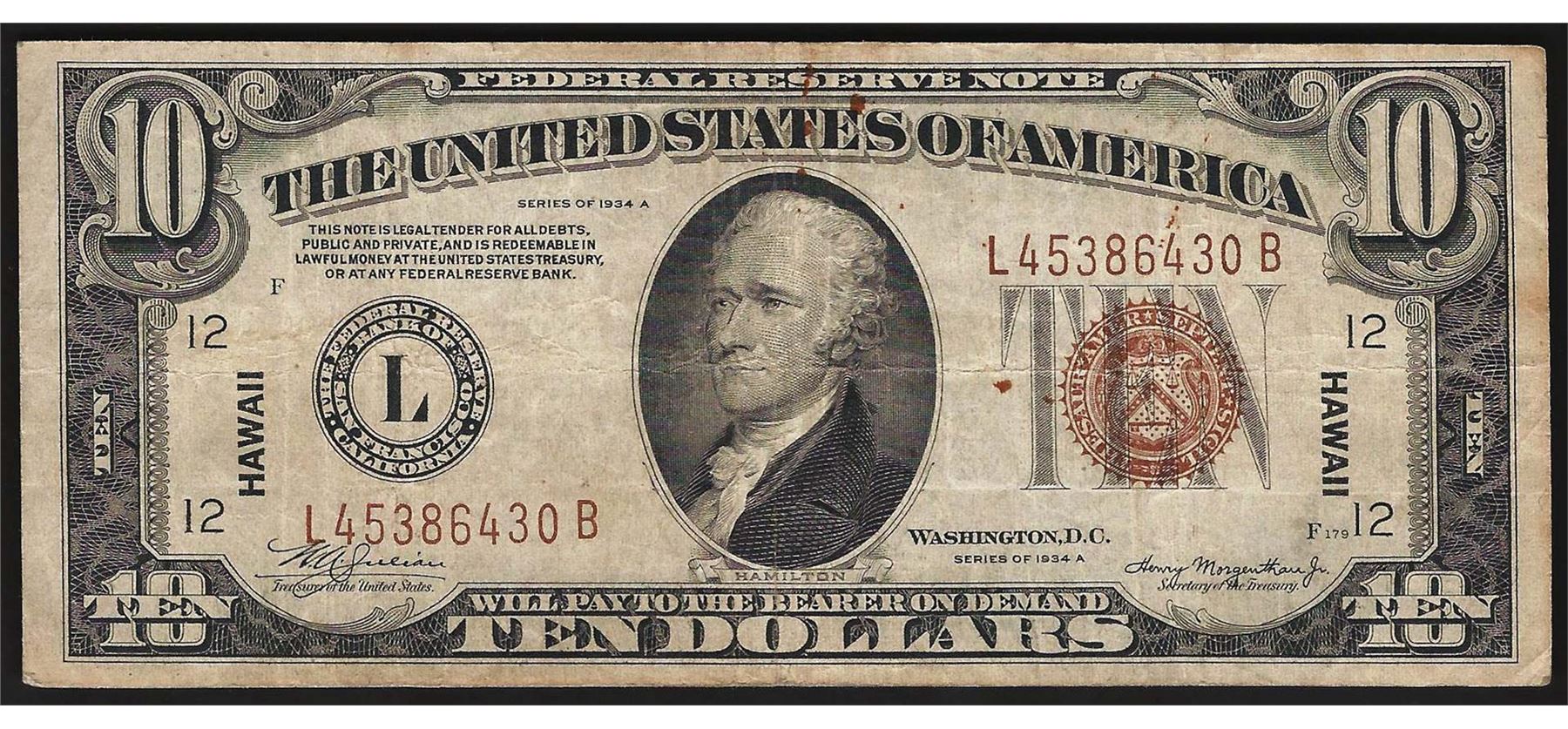 One 1934A $10 Hawaii Federal Reserve Note WWII Emergency Note.