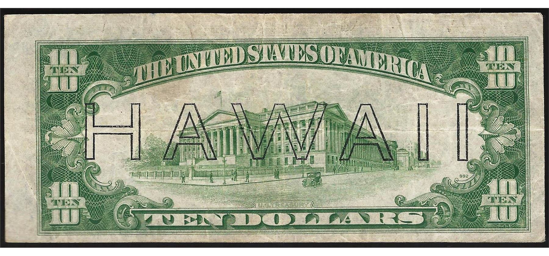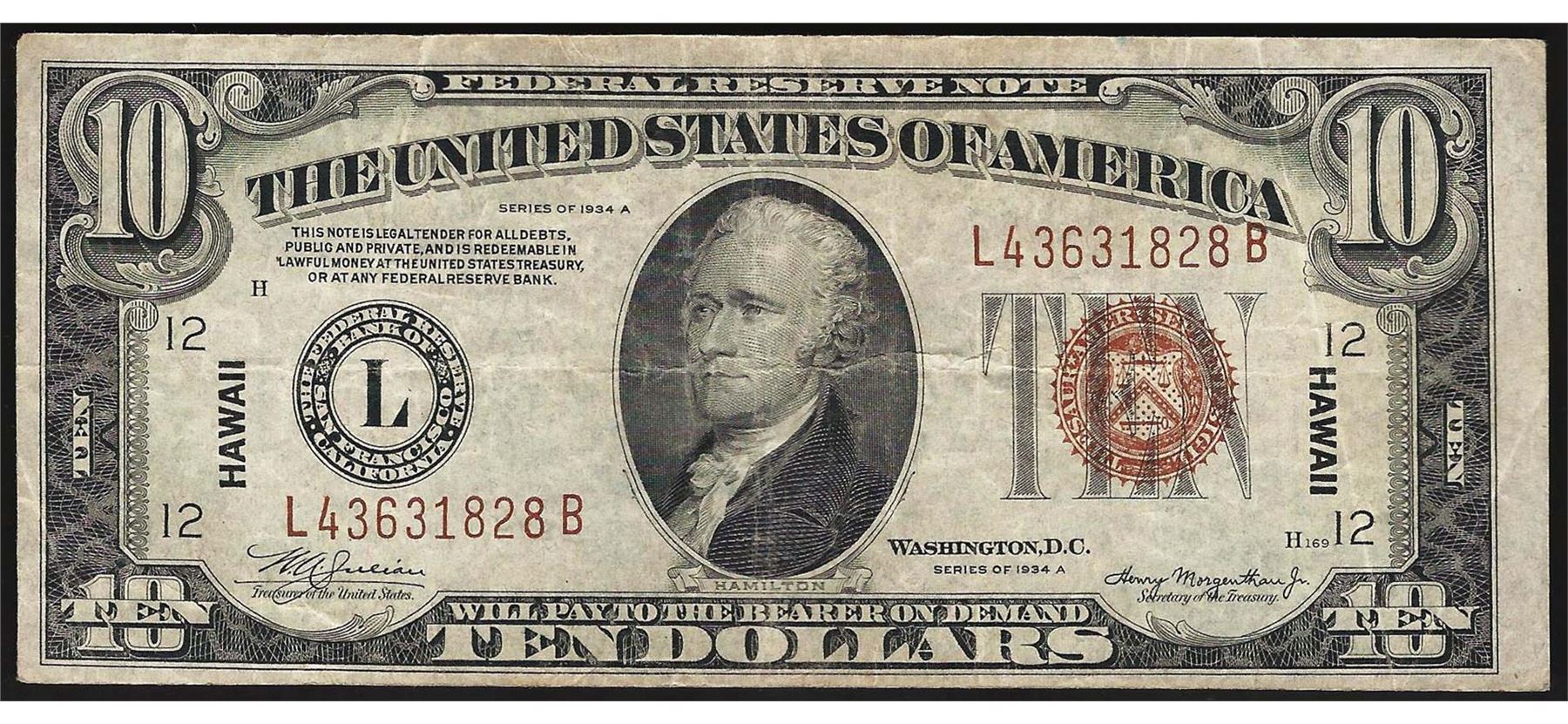 One 1934A $10 Hawaii Federal Reserve Note WWII Emergency Note.